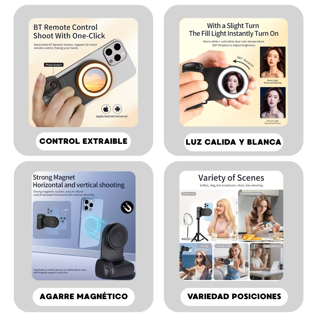 Cuenta con rosca estándar, lo que garantiza una fijación firme y duradera, compatible con trípodes, soportes externos y accesorios profesionales, su sistema Maglev permite una sujeción segura del smartphone, facilitando una instalación rápida y práctica.
